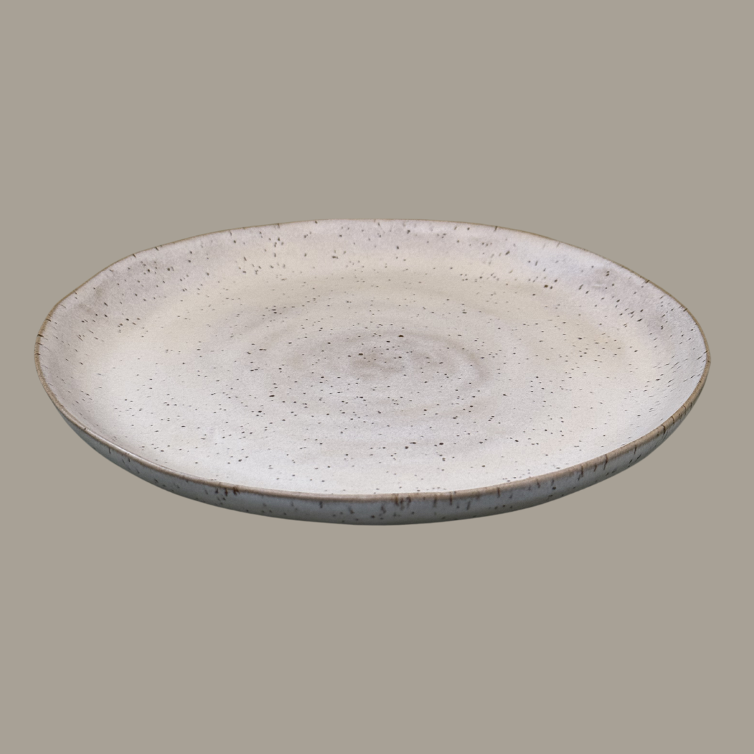 Een zachte, matte witte glazuur die de spikkels in de klei benadrukt.