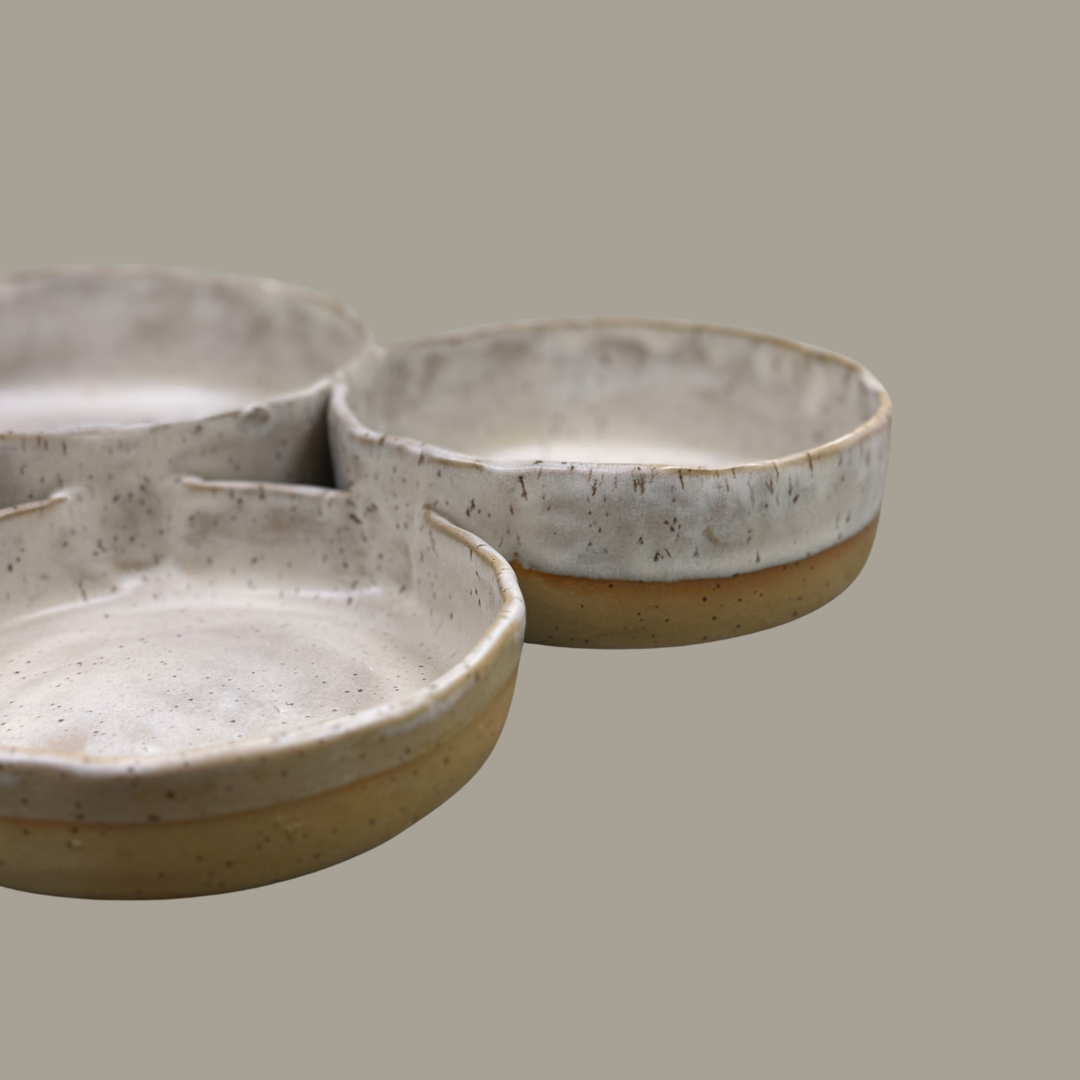 Een zachte, matte witte glazuur die de spikkels in de klei benadrukt.