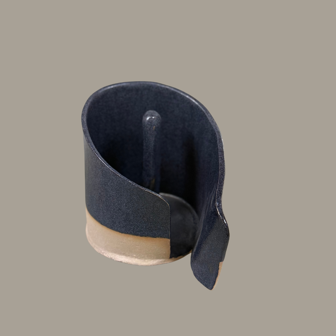 Een diepzwart glazuur met een elegante zijden‑glans en subtiele blauwachtige schijn, die een strakke, tijdloze en verfijnde uitstraling geeft.