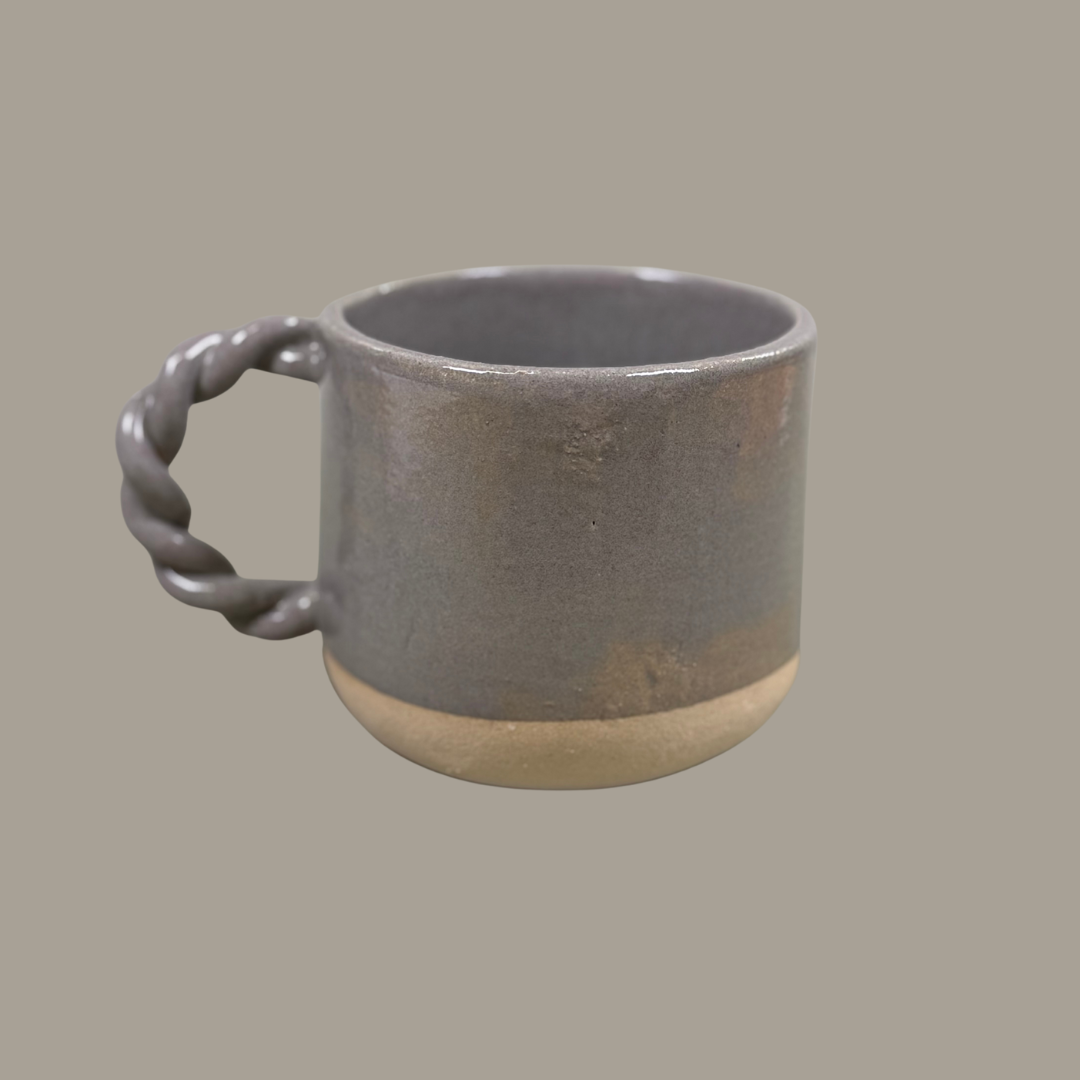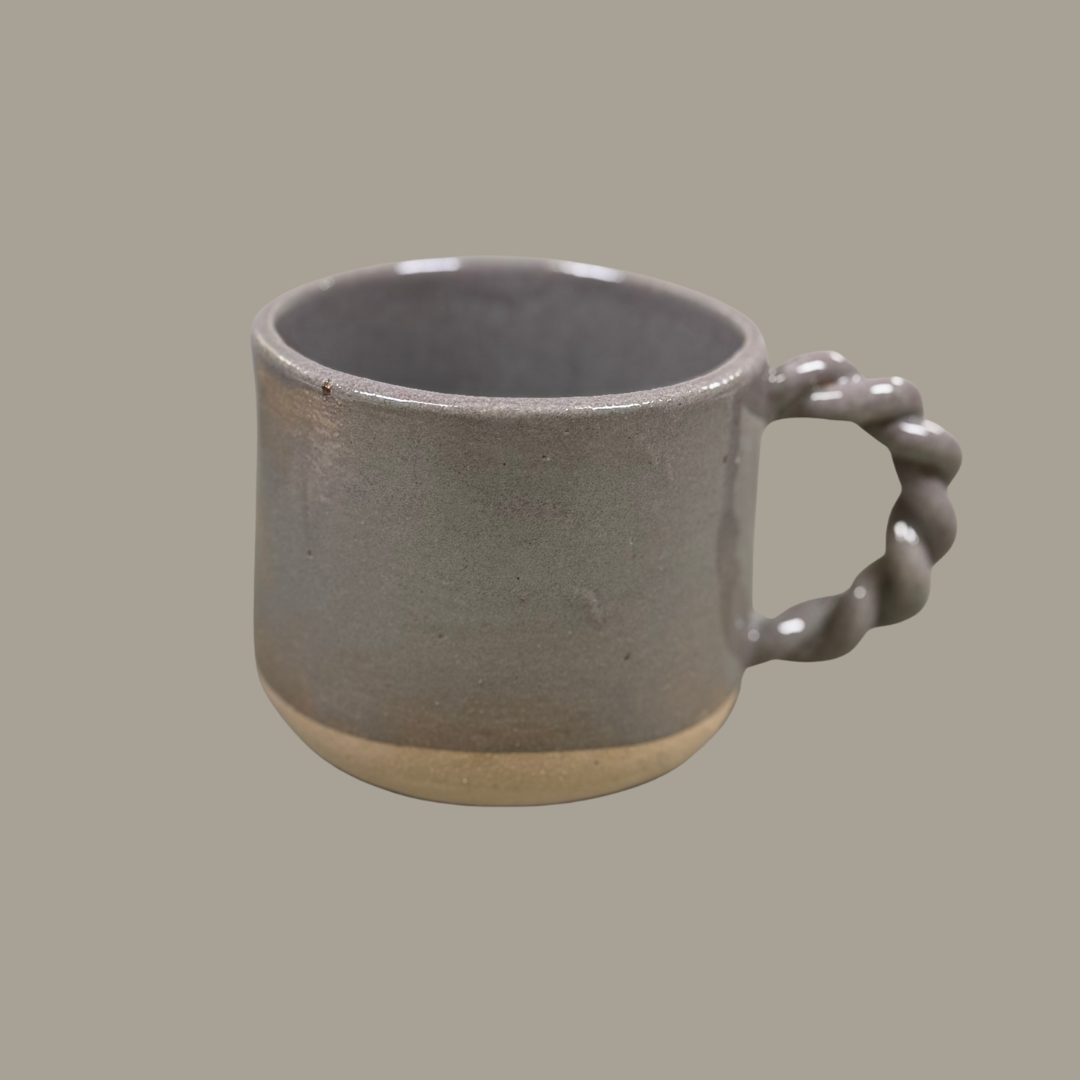 Een warme grijsgroene glazuur met subtiele, luchtige tinten roze.