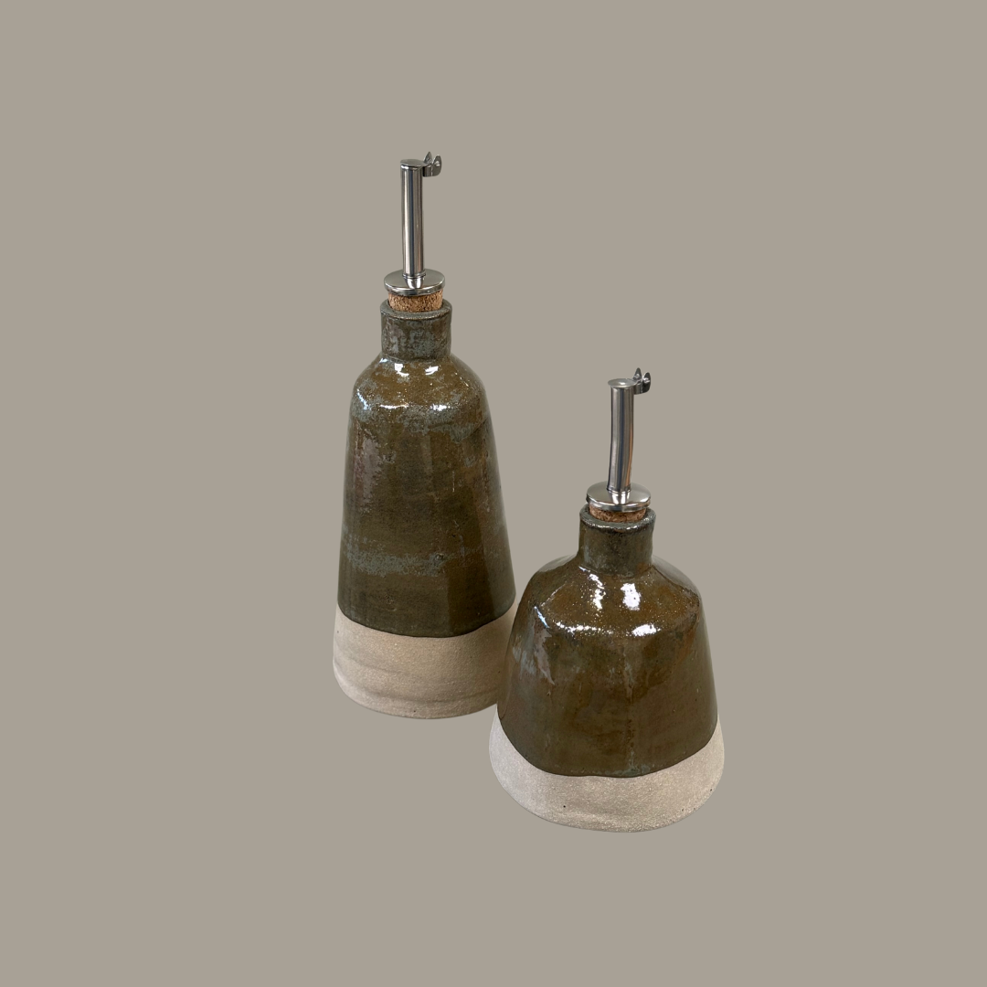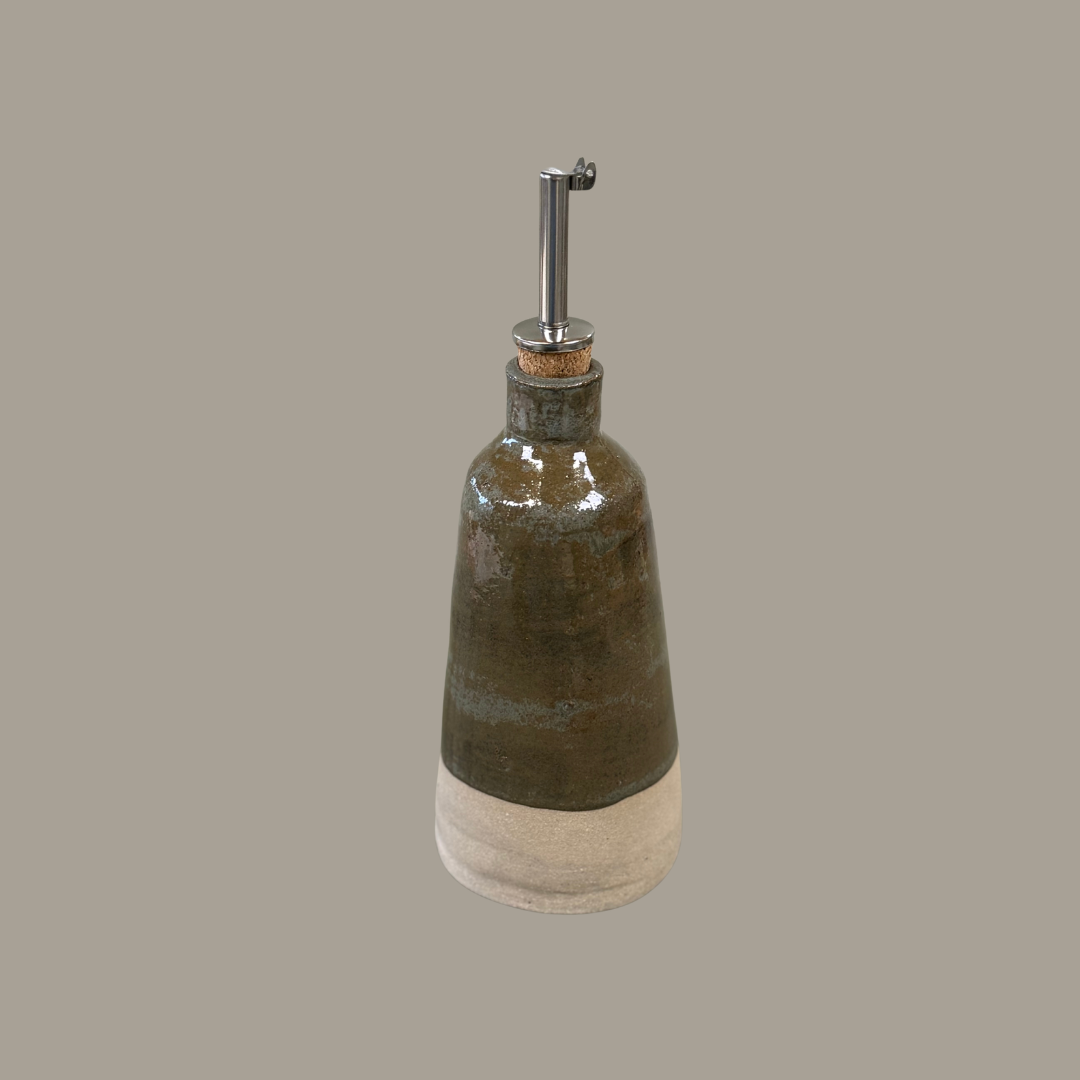 Een zachte grijs‑groene glazuur met subtiele tintvariaties. De kleur is warm en natuurlijk, geeft elk stuk karakter.