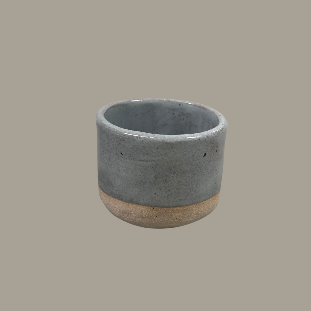 Een warme grijsgroene glazuur met subtiele, luchtige tinten roze.