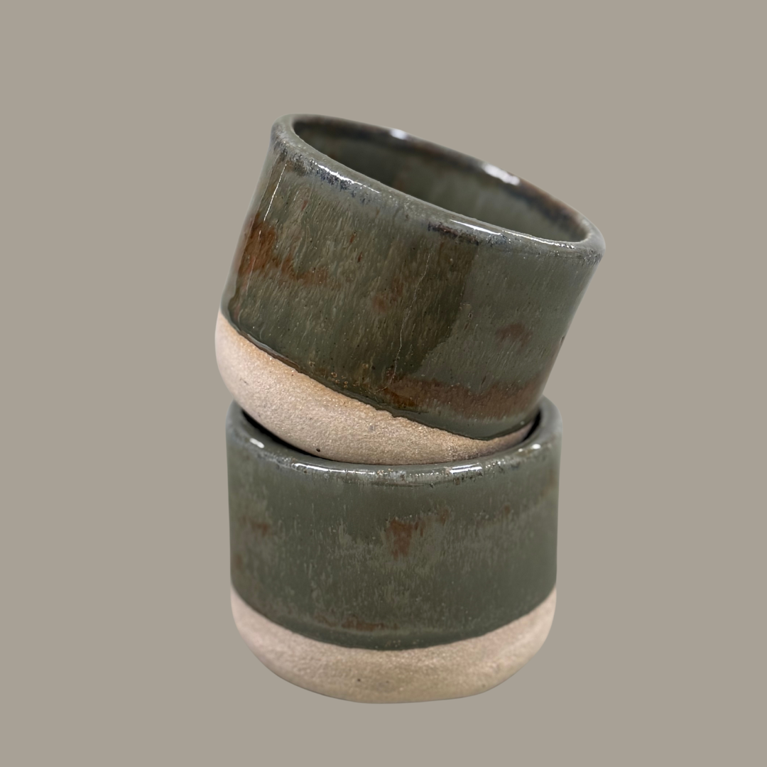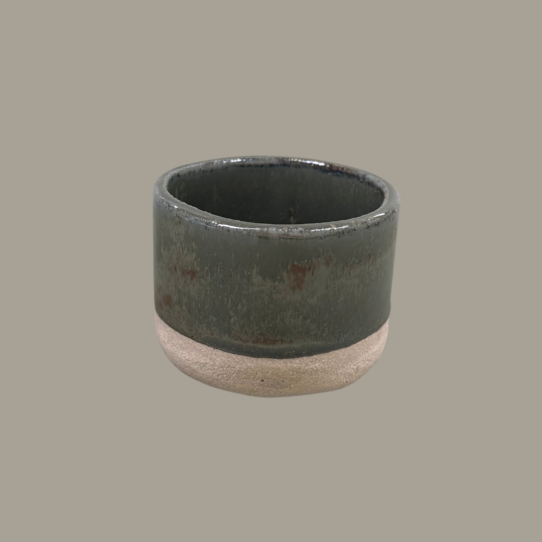 Een zachte grijs‑groene glazuur met subtiele tintvariaties. De kleur is warm en natuurlijk, geeft elk stuk karakter.